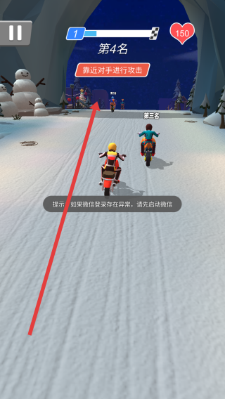 2、比赛中处于第4名时,驾驶摩托加速靠近前方对手,若携带武器则发动攻击,借此提升排名,向着更高名次冲刺。