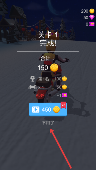 3、关卡1完成后,若不愿观看广告获取450金币,点击不用了按钮,直接领取150金币等基础奖励,结束本次关卡。