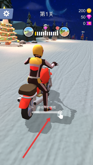 1、在摩托游戏第1关界面,滑动屏幕启动摩托,驾驶它在雪地赛道开启竞速挑战,准备应对赛程中的障碍与对手。