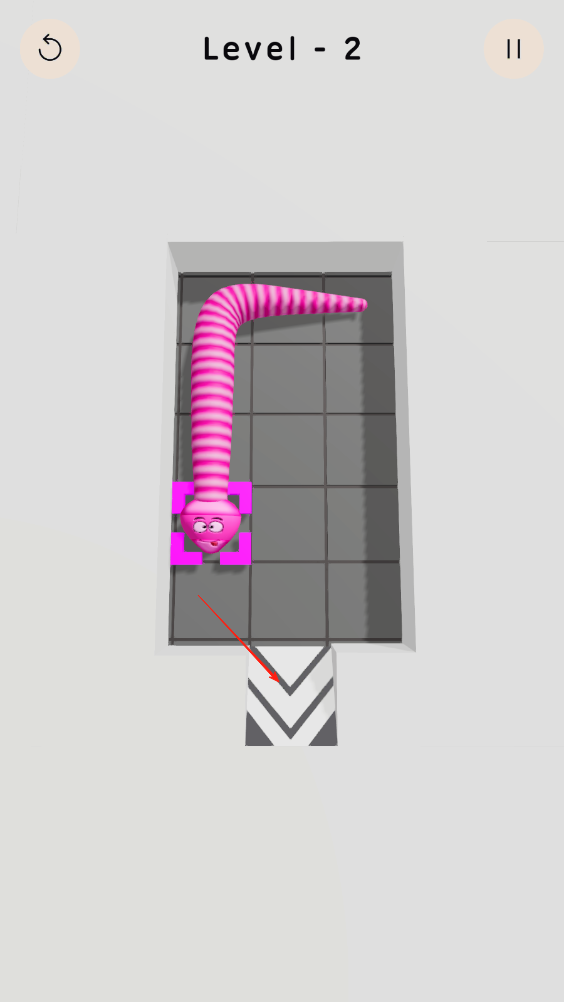 1、操控贪食蛇,观察关卡中出口位置,规划移动的路径,让蛇头朝着出口方向,避开自身的身体,顺利抵达出口完成关卡。