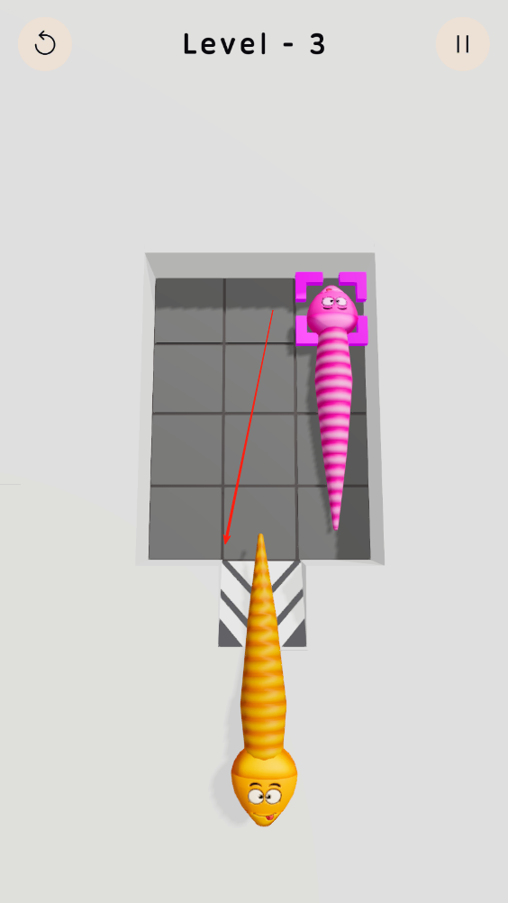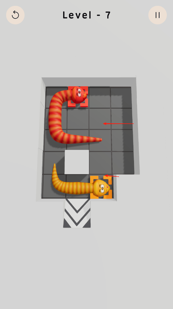 2、多蛇关卡,分别控制不同颜色蛇,规划各自移动路线,使它们依次通过出口,注意避免两只蛇蛇身相互碰撞,确保都能通关。