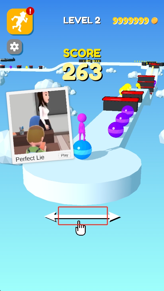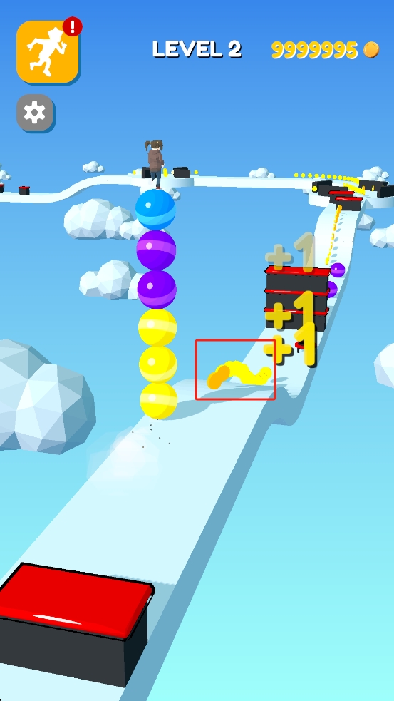 2、角色行进时,操控其避开红框内黄色弯曲障碍,收集彩球,借助彩球叠加让球堆更高,顺利通过路径。