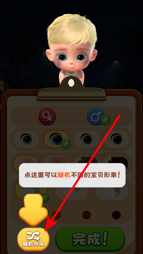 1、角色形象设置界面,若想换不同宝贝形象,点击左下角随机外观按钮,即可随机切换多样样式,耐心刷选直到出现满意形象,再点完成确定。