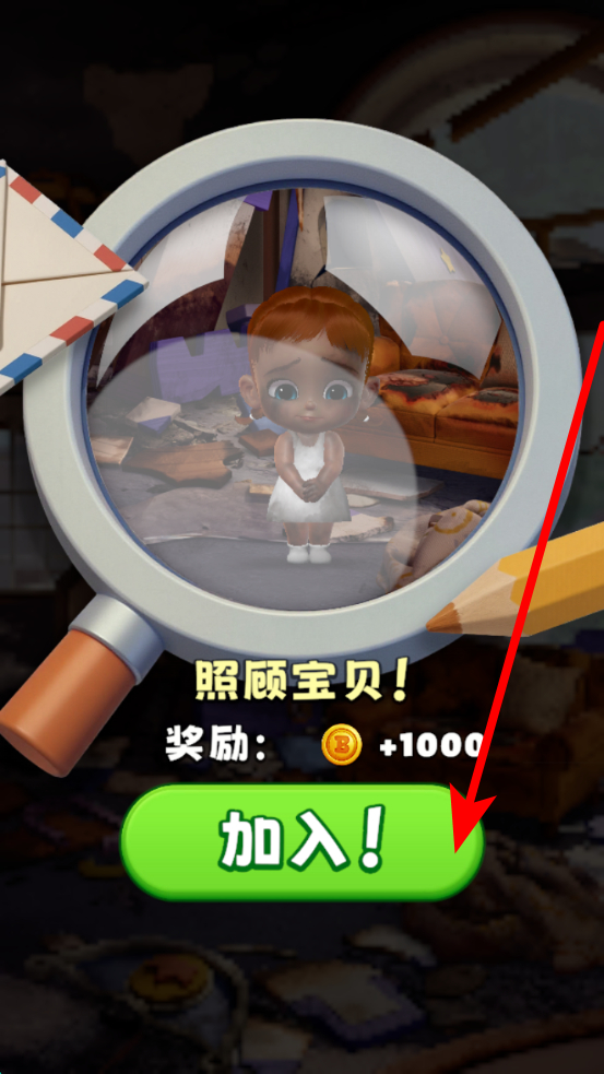 2、看到照顾宝贝提示及奖励后,果断点击加入按钮,参与专属趣味照顾任务,完成后稳定获取1000金币奖励,高效助力资源积累与玩法解锁。
