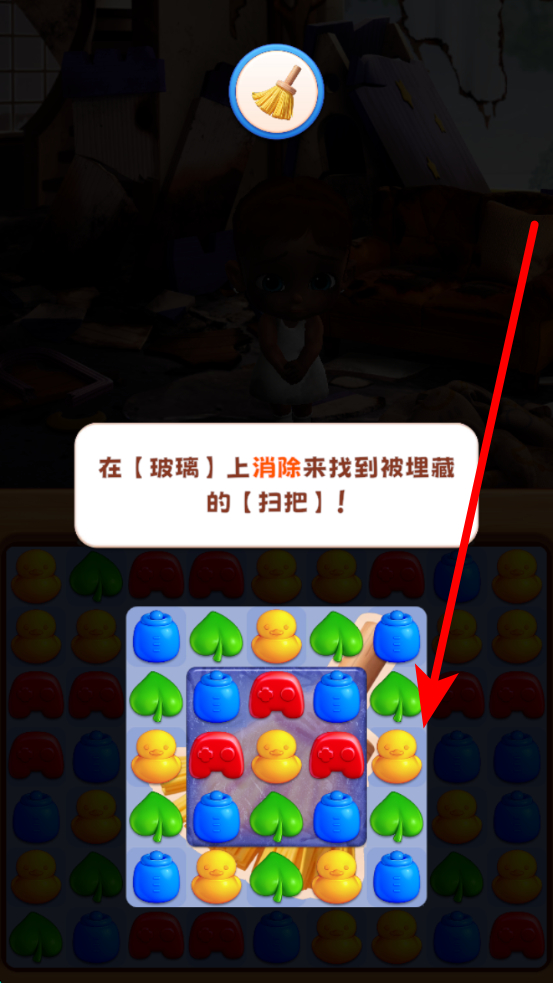 3、消除关卡,严格按提示在玻璃区域消除,通过匹配同色元素连续消除,逐步揭开隐藏覆盖区域,顺利找到被埋藏的扫把,稳步推进关卡进程。
