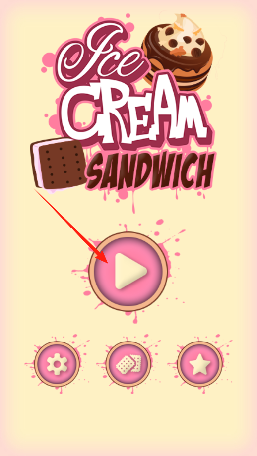 1、看到游戏主界面,中间有个播放按钮,点它就能开始做冰淇淋三明治的游戏啦,进入游戏后,应该会有各种食材,等着我们去搭配制作。