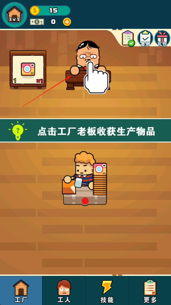 1、点击工厂老板,收获生产出的物品,积累金币资源,这些物品可用于后续工厂的扩建、升级等操作。