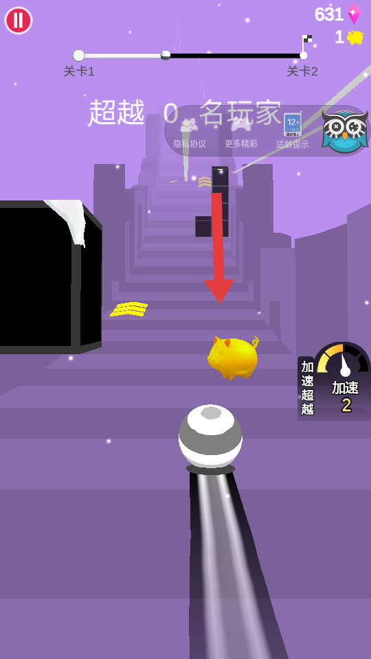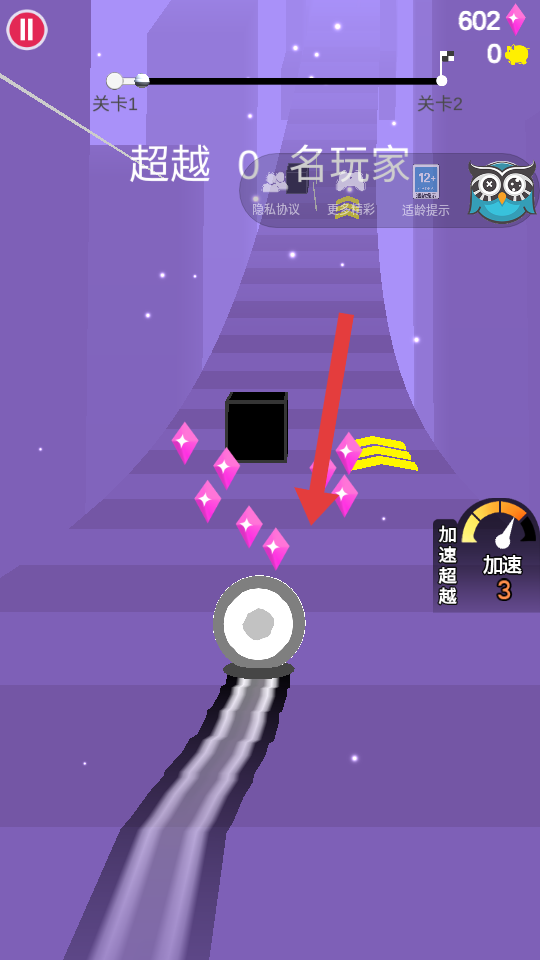 1、进入关卡,沿紫色阶梯赛道前行,按红色箭头指引方向,避开黑色方块障碍,收集粉色菱形道具。