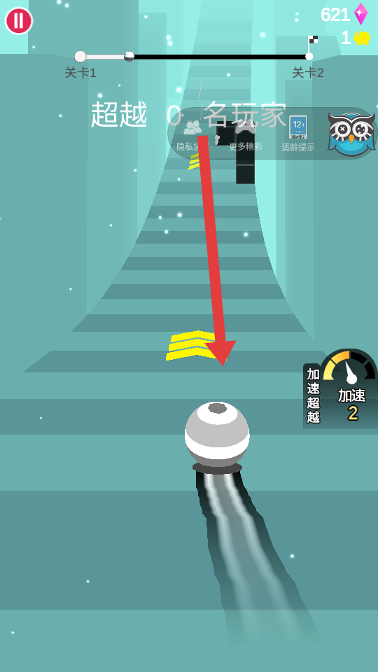 2、遇到黄色加速带,引导球体驶入,触发加速效果,快速通过该路段,注意上方超越几名玩家进度。