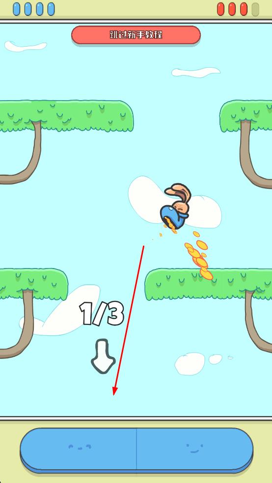 2、长按滑动使兔子跳跃,跨越空中地形,收集金币,完成阶段任务。