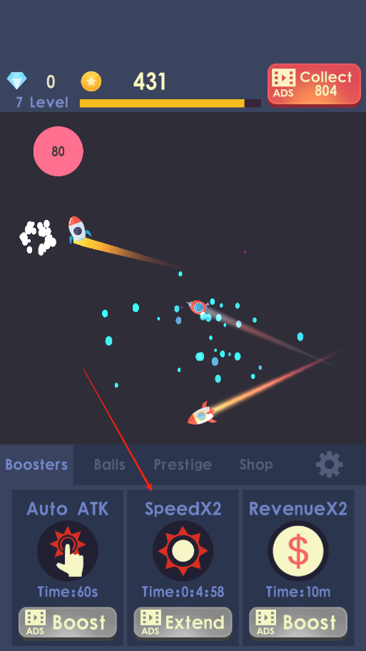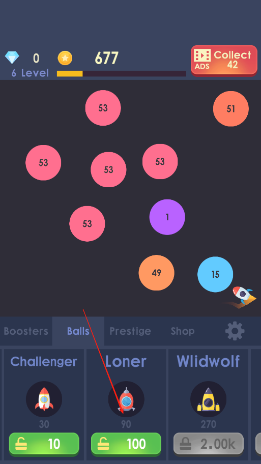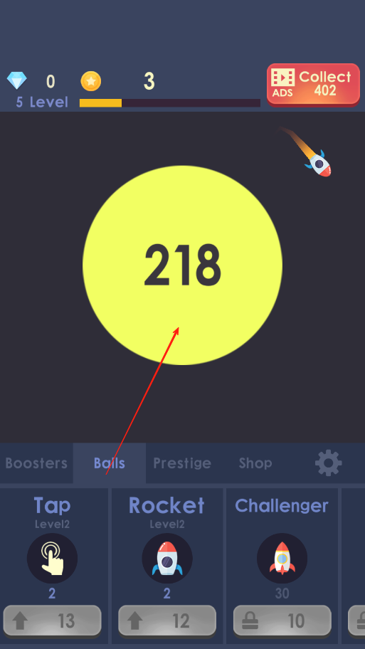 2、面对多色数字圆球,选择对应火箭发射,消耗圆球数值获取金币,金币可升级火箭或解锁新功能。