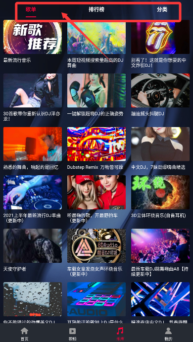 4、进入音乐库,可查看精选歌单、排行榜单等专业DJ资源合集。