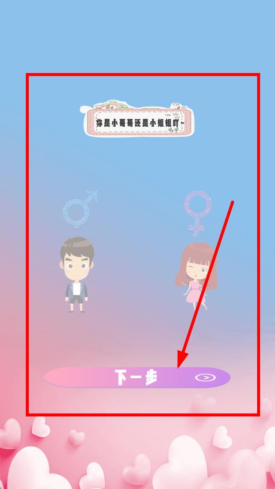 1、在性别选择界面,先选定代表小哥哥或小姐姐的卡通人物,确认后点击底部【下一步】按钮,推进到下一个操作环节,开启后续流程。