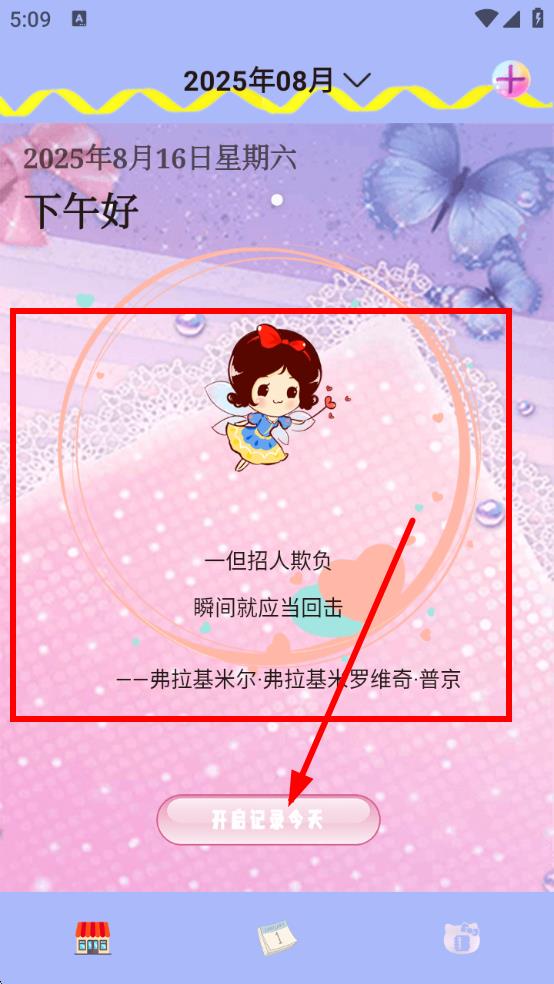 2、阅读一但招人欺负,瞬间就应当回击等内容后,点击【开启记录今天】按钮,进入手账记录相关功能,准备记录日常。