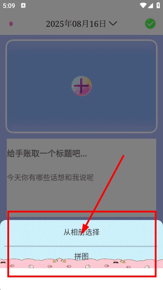 3、在手账若想添加图片素材,点击【从相册选择】选项,从手机相册挑选合适的照片,插入到手账中,丰富手账内容。