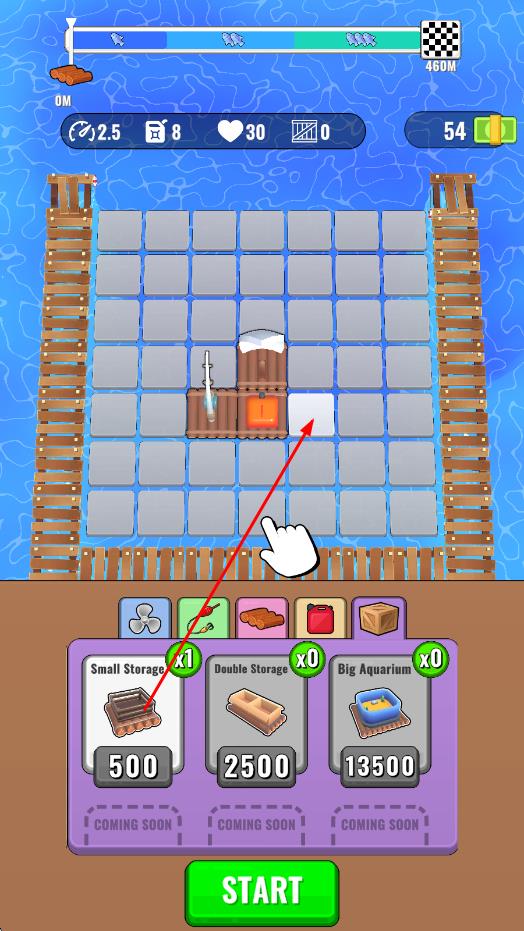 1、进入游戏后登上木筏,整理基础渔具,选择合适的鱼饵挂在鱼钩上,对准海面抛出鱼线,开始首次海上垂钓体验。