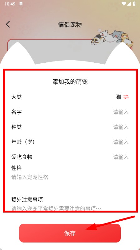 3、填写萌宠大类、名字等信息,点击保存,完成宠物添加。