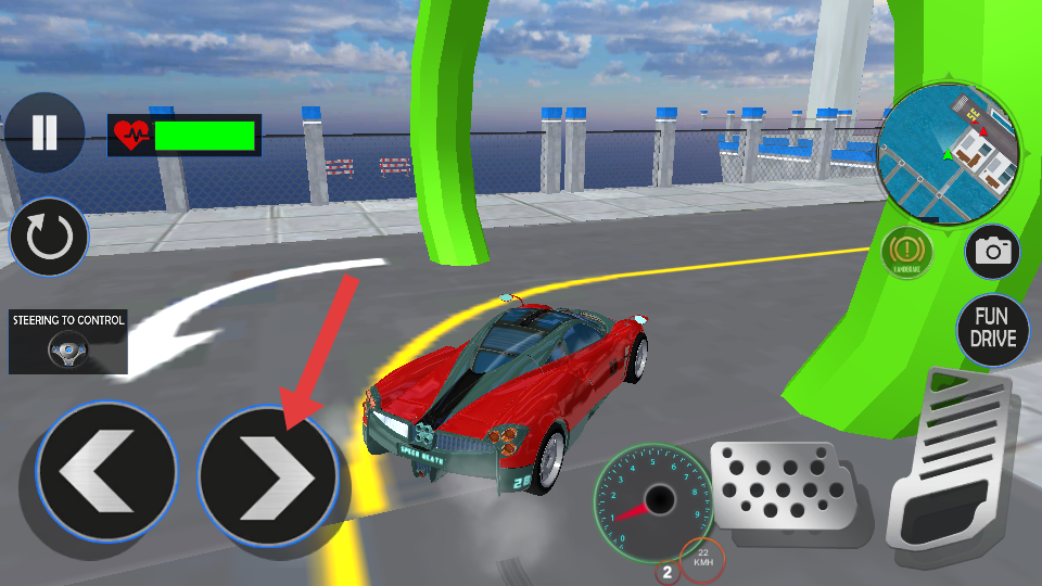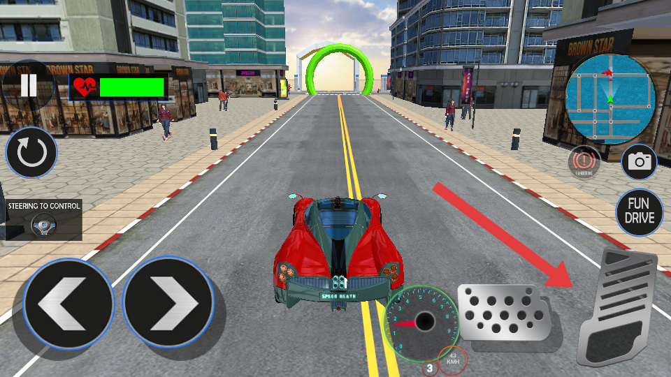 2、依照方向键操控红色跑车,躲避城市道路行人与建筑,朝着绿色拱门标识前进,注意观察血量、速度表确保行驶稳定。