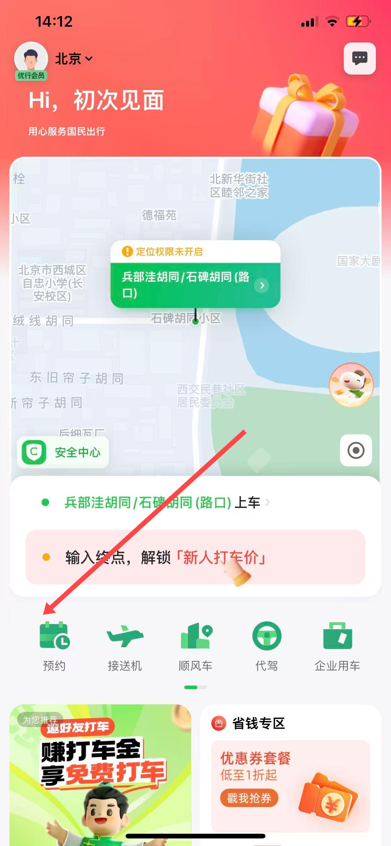 1、打开曹操出行App,进入主界面后,找到并点击预约选项,进入预约用车页面。