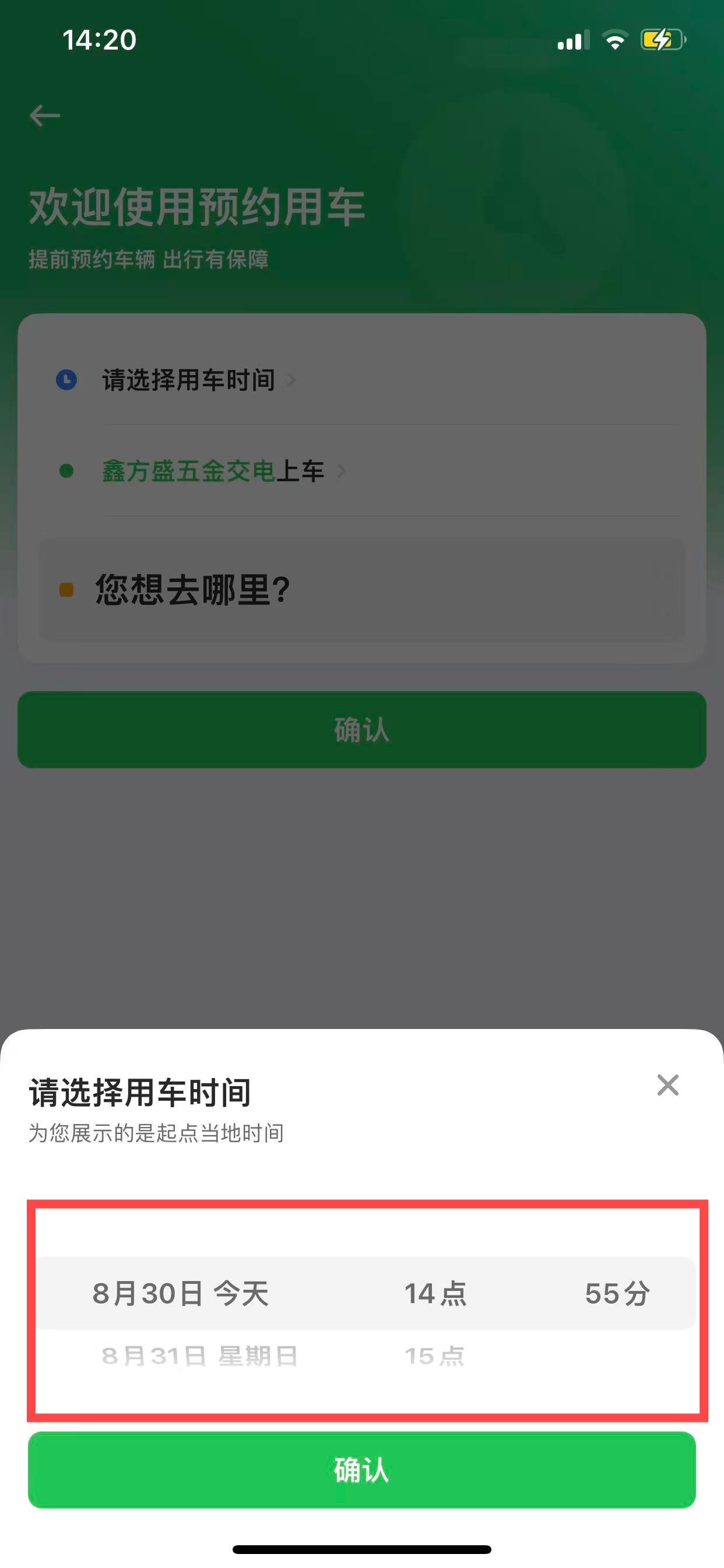 2、在预约用车页面,点击请选择用车时间选项,选择日期和时间。