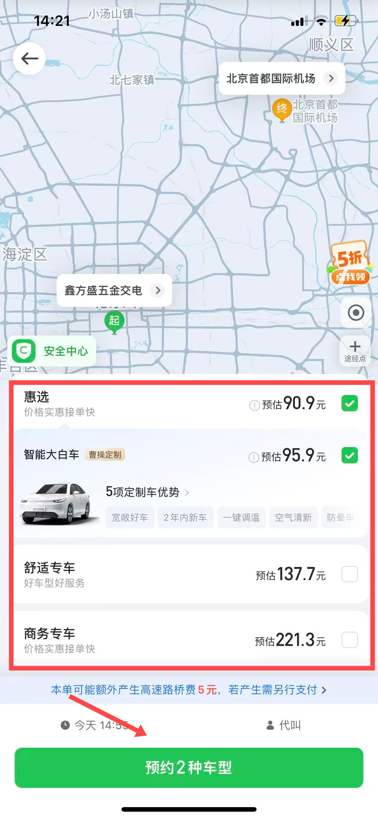 4、显示不同的车型选项,如惠选、智能大白车、舒适专车、商务专车等,根据自身需求和预算进行选择,点击预约XX车型按钮,完成预约。