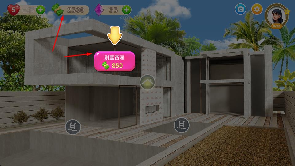 1、在房屋建造界面,可消耗金币,逐步搭建别墅结构,推进建筑进程。