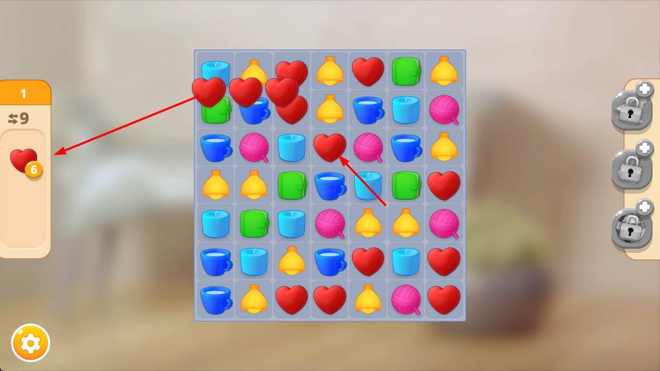 2、进入消除关卡,通过消除相同图案,完成收集目标,获取建造资源或金币。