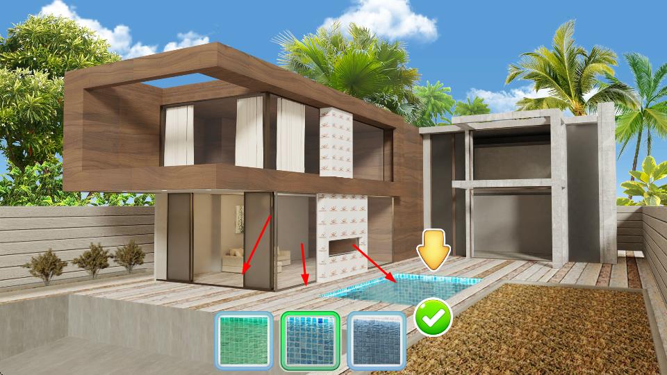 3、回到建造场景,选择不同装饰材质,对别墅、泳池等进行美化,打造个性化房屋外观。
