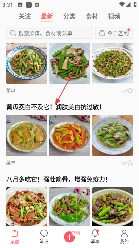 1、在最新页面,点击黄瓜茭白不及它对应的菜谱区域,进入相关菜谱列表页。