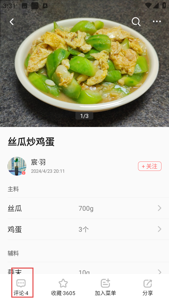 3、在丝瓜炒鸡蛋菜谱详情页,点击评论查看其他用户的评论。