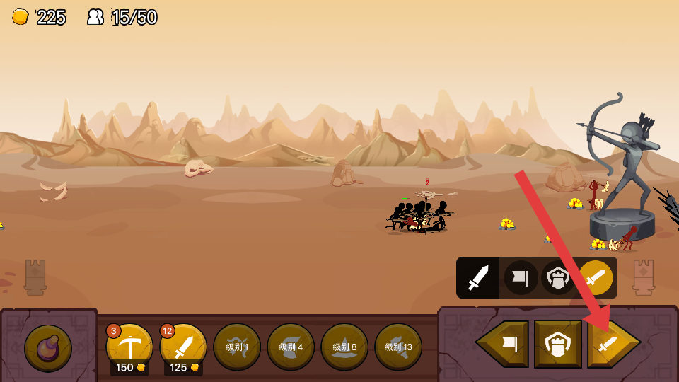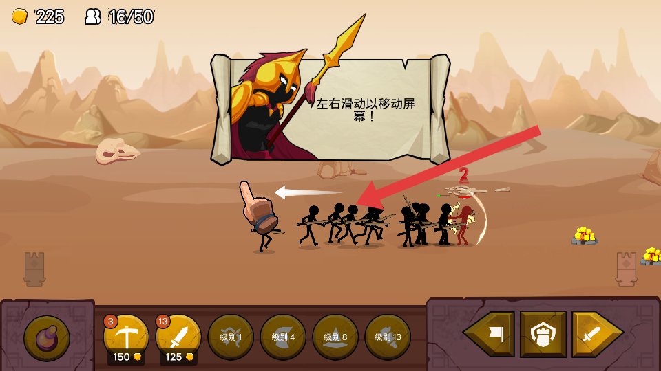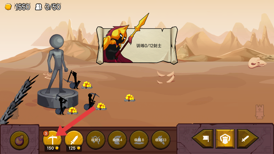 1、游戏开局,可花费125金币训练剑士,按提示逐步完成训练0/12剑士的招募任务,组建基础战斗部队。