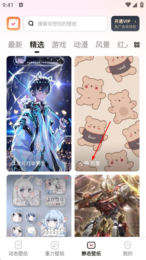 2、在静态壁纸页面,选择喜欢的壁纸,如小熊可爱壁纸。