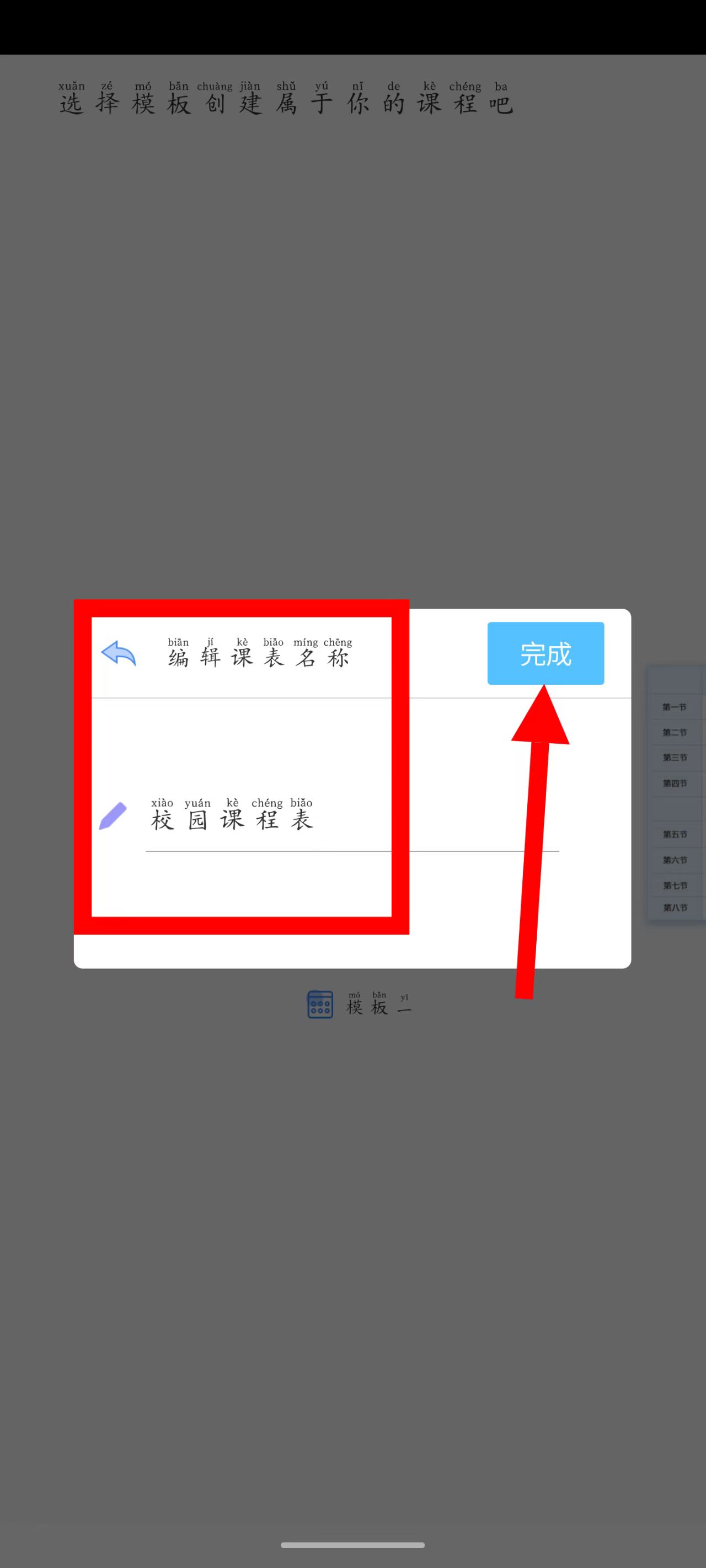 2、弹出编辑课表名称弹窗后,确认或修改课表名称,点击完成按钮,完成课表创建。