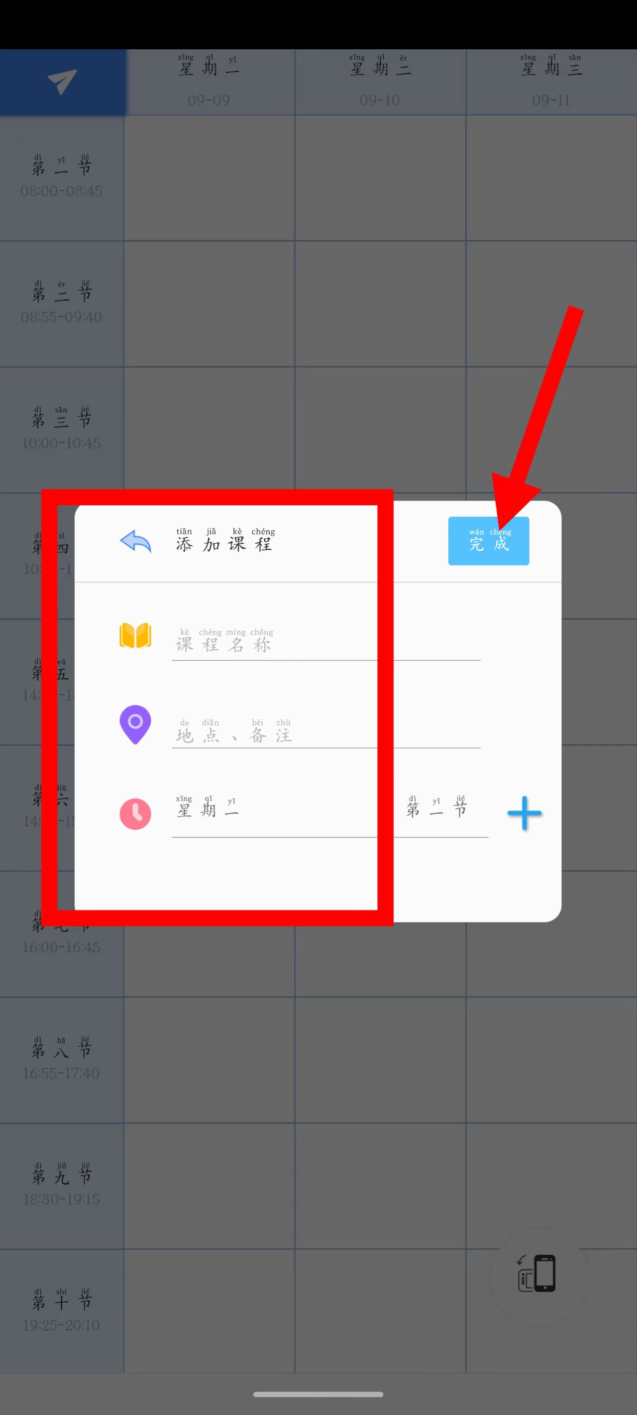 4、在弹窗添加课程,填写完毕后点击完成按钮,即可将课程添加至课表。