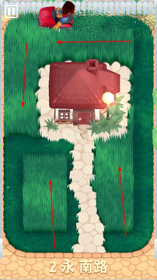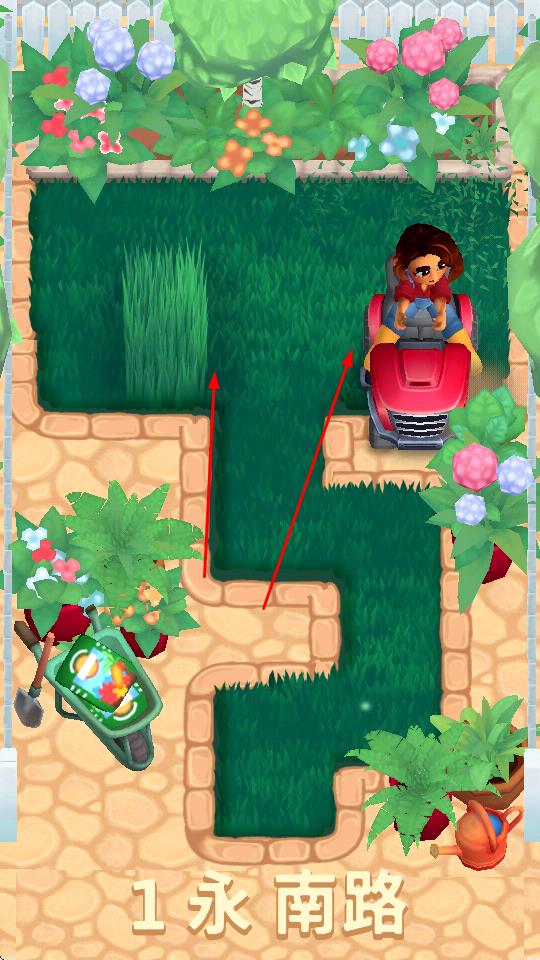 3、在1永南路等区域,按箭头指引的方向割草,逐步清理指定范围的草地,让花园更整洁。