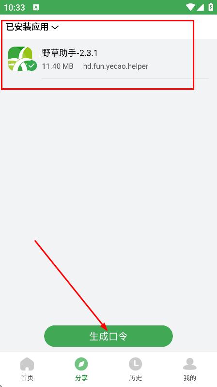 3、在分享页面,选择已安装的应用,点击生成口令。