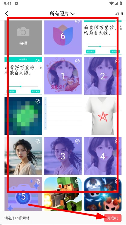 3、在照片选择页面,选择素材照片后,点击完成按钮,进入模板拼图页面。