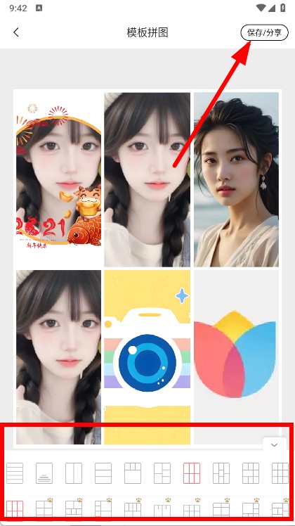 4、选择合适的拼图模板,调整图片位置和大小后,点击右上角的保存与分享按钮,完成拼长图操作。