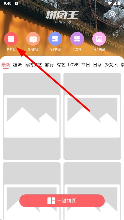 2、在APP主界面,点击拼长图选项,进入照片选择页面。