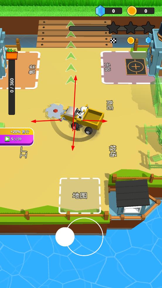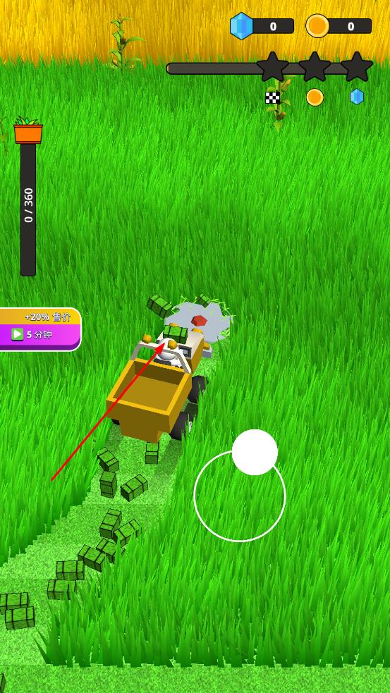 2、驾驶车辆到草地等区域,利用车头锯片收割草块等资源,收割时会掉落可收集的资源材料。
