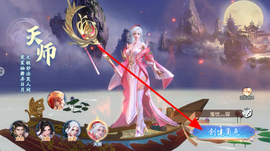 1、进入游戏后,在角色选择界面,有多种职业角色可供挑选,选好心仪角色后,点击创建角色按钮,即可成功创建,开启后续仙侠冒险。