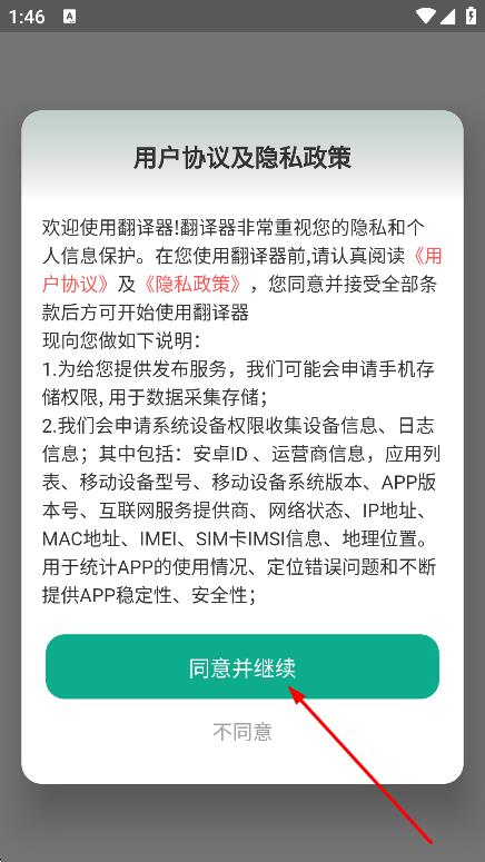 1、在用户协议及隐私政策弹窗中,点击同意并继续。