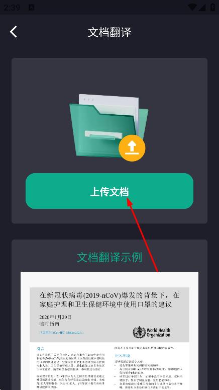 3、在文档翻译页面,点击上传文档,选择要翻译的文档。