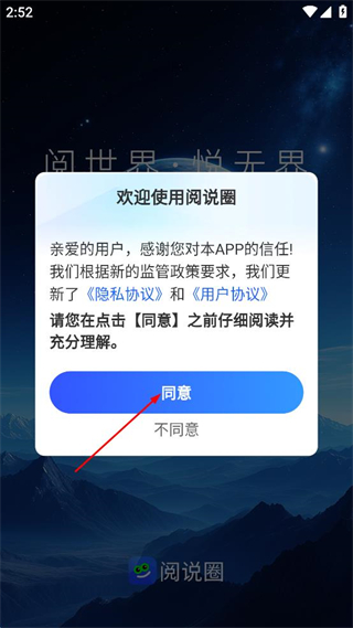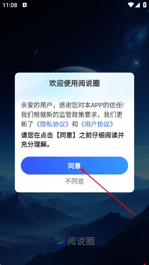 1、打开阅说圈,在弹出的协议提示框中,点击同意按钮,进入账号密码登录页面。