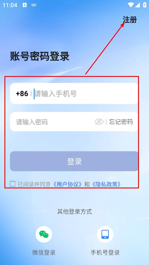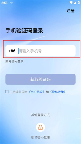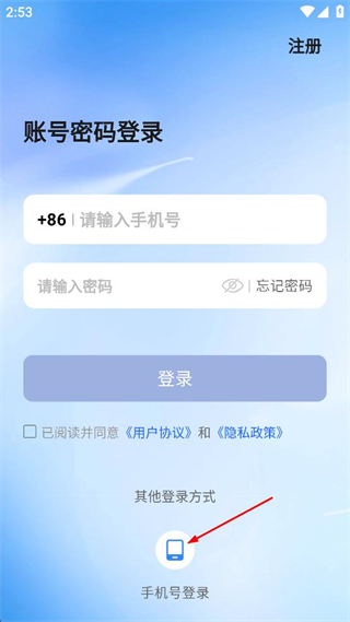 2、在账号密码登录页面,点击底部的手机号登录选项,切换至手机验证码登录界面。