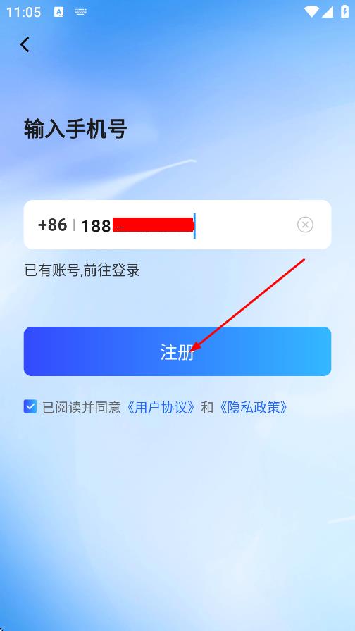3、在输入手机号页面,输入手机号,勾选同意协议后,点击注册。