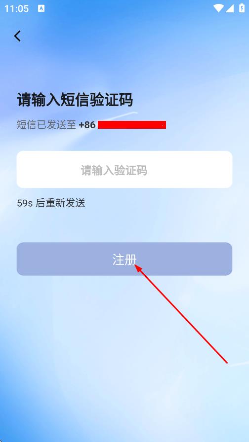 4、输入短信验证码页面,输入收到的验证码后,点击注册,完成注册。