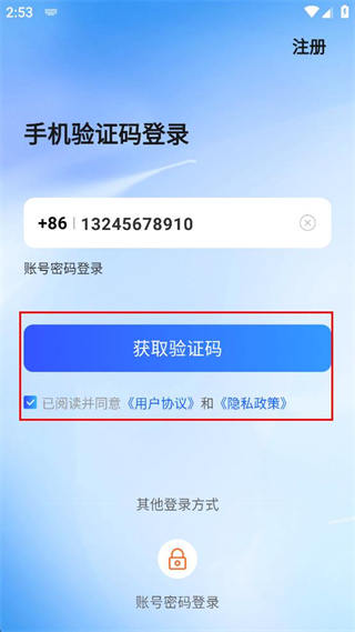 4、勾选已阅读并同意相关条款,点击获取验证码按钮,准备获取登录所需的验证码。