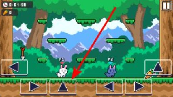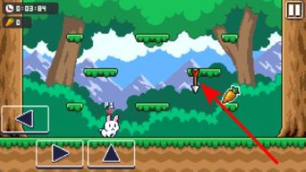3、游戏界面有方向键等操作按钮,点击向上的箭头按钮,可操控兔子向上跳跃,借此到达更高的平台,探索更多区域。