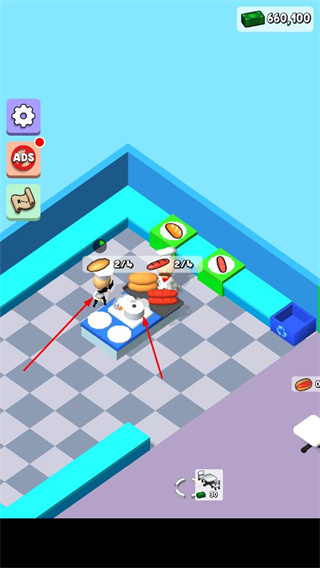 1、玩家操控厨师角色在餐厅内移动可向多个方向移动,目的是为顾客制作并提供食物。